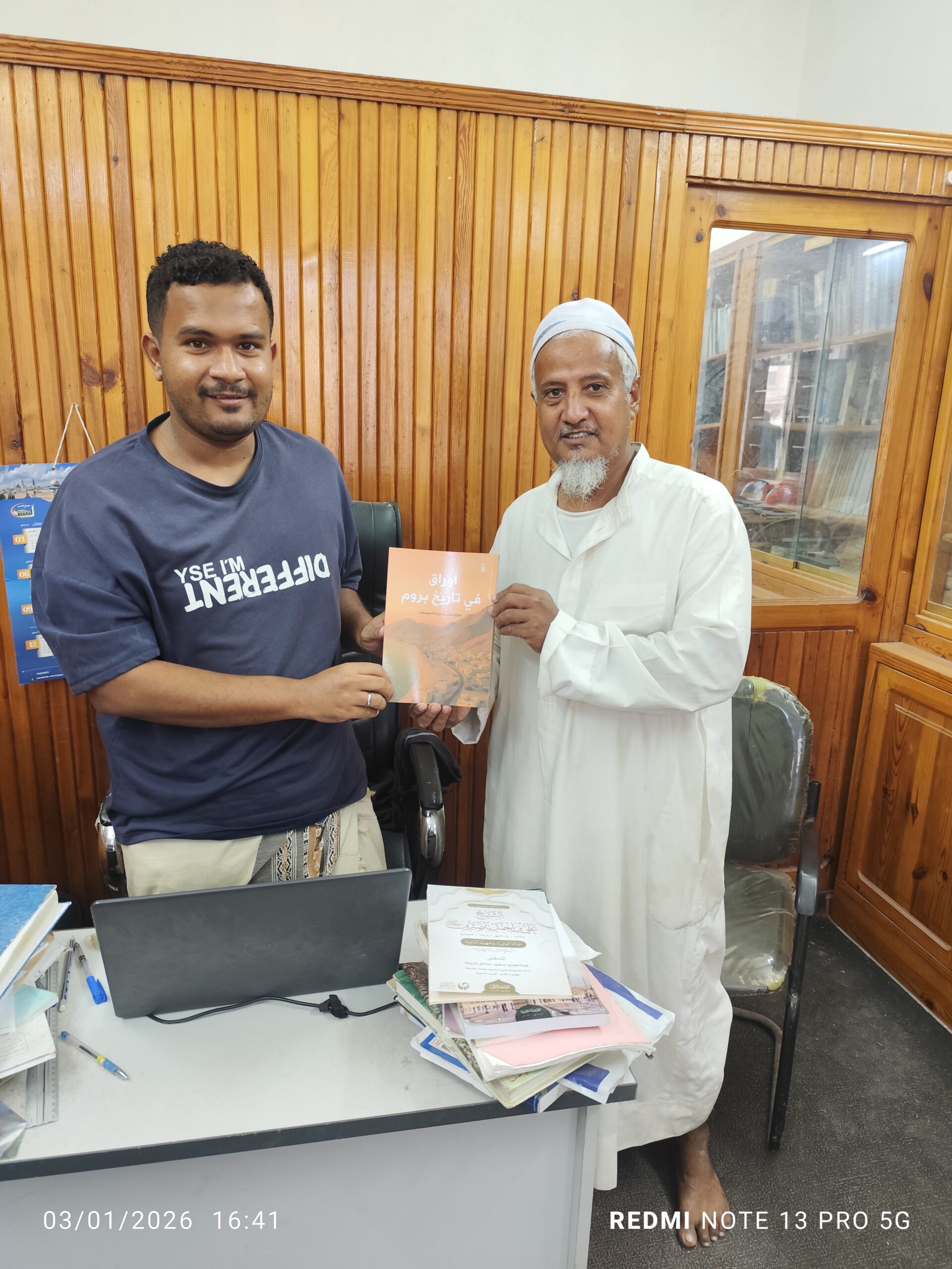 وقدم الباحث للأخ محمد عبدالعزيز بامحسون أمين المكتبة كتاب( أوراق في تاريخ بروم) .